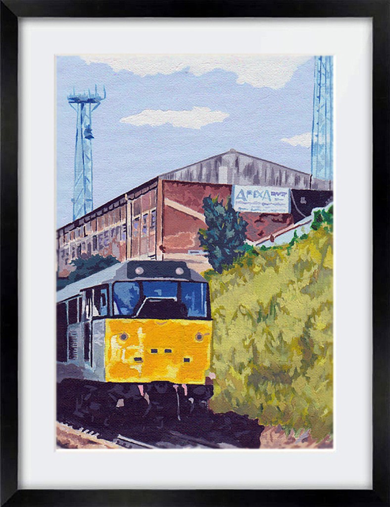 A class 31 diesel locomotive trundling past the Railway End at St. Andrews, home of Birmingham City. Rendered in oils. Original sold to a Blues friend of mine, Craig Roosen, who is one of the administrators on Lost Football Grounds and Terraces of the UK