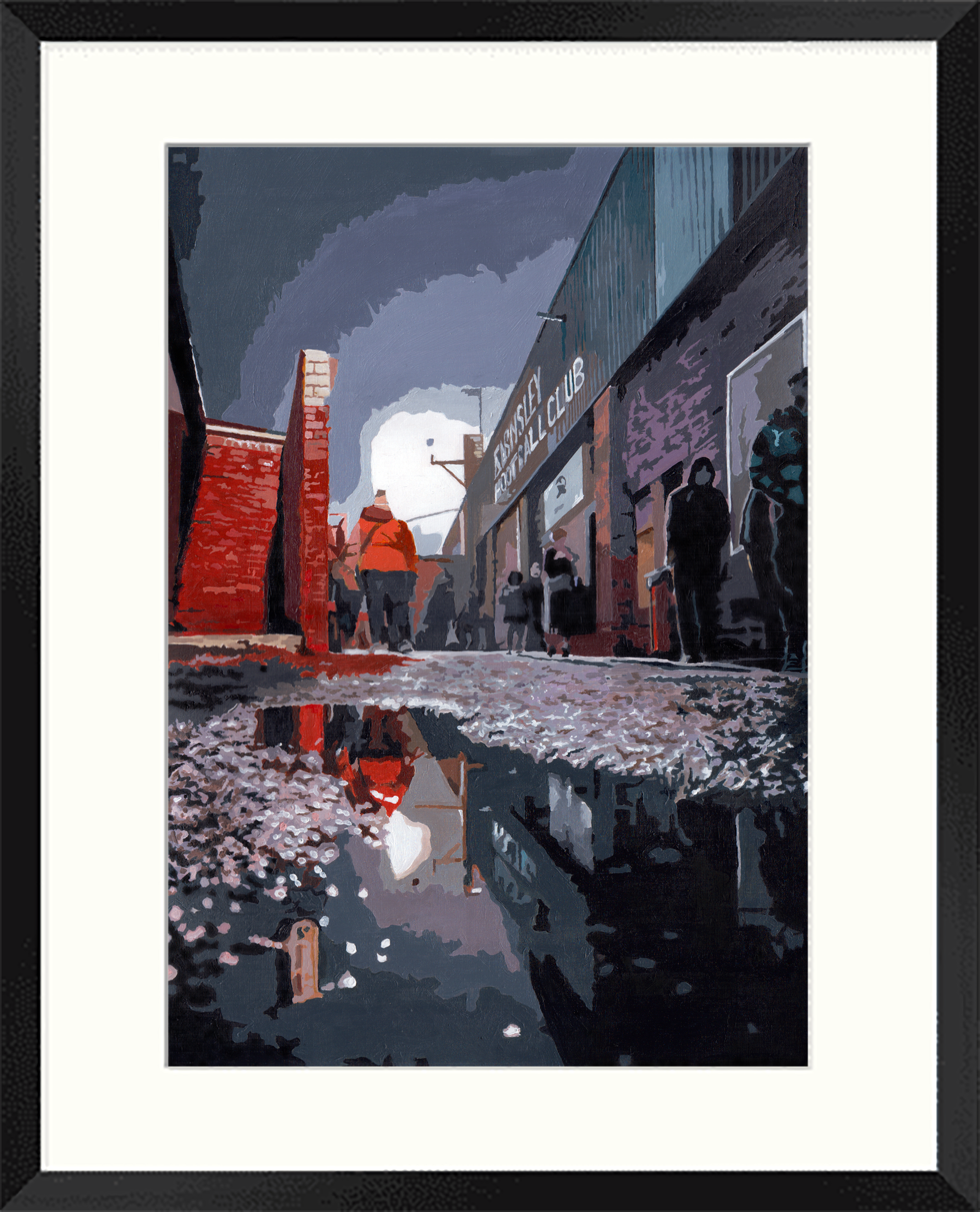Oakwell, Barnsley on a typically British rainly winter evening. I saw this image on a Facebook football stadium site and secured the permission of the photographer, Daniel Berry, who kindly allowed me to use it as source material. FOR SALE